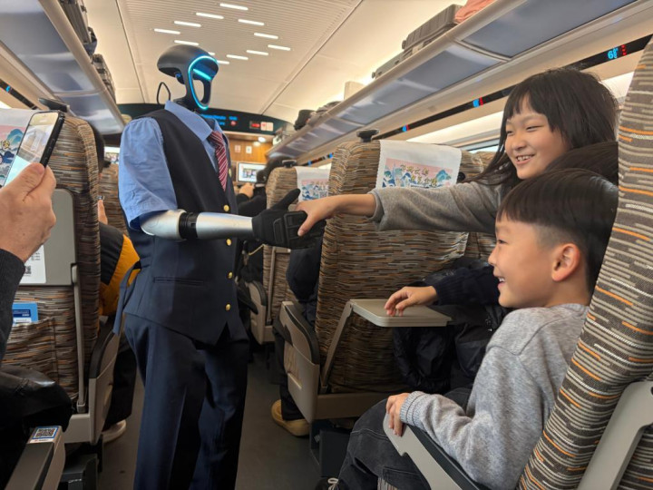 图为小一又友在车厢内与机器东说念主乘务员互动。新华社记者魏一骏摄